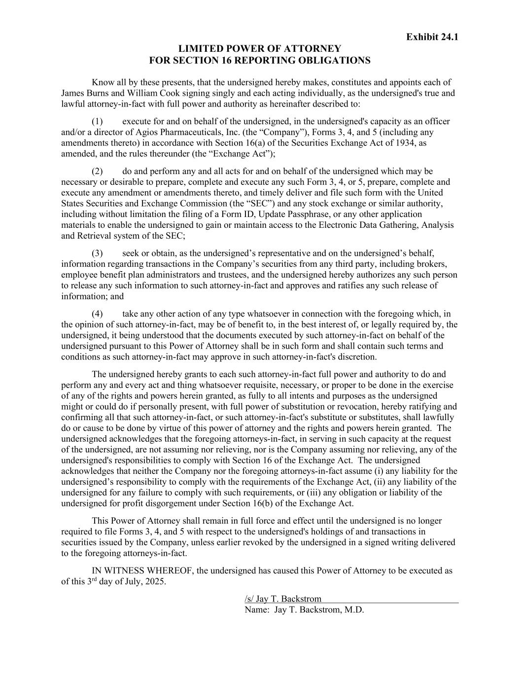 Exhibit 24.1 LIMITED POWER OF ATTORNEY FOR SECTION 16 REPORTING OBLIGATIONS Know all by these presents, that the undersigned hereby makes, constitutes and appoints each of James Burns and William Cook signing singly and each acting individually, as the undersigned's true and lawful attorney-in-fact with full power and authority as hereinafter described to: (1) execute for and on behalf of the undersigned, in the undersigned's capacity as an officer and/or a director of Agios Pharmaceuticals, Inc. (the “Company”), Forms 3, 4, and 5 (including any amendments thereto) in accordance with Section 16(a) of the Securities Exchange Act of 1934, as amended, and the rules thereunder (the “Exchange Act”); (2) do and perform any and all acts for and on behalf of the undersigned which may be necessary or desirable to prepare, complete and execute any such Form 3, 4, or 5, prepare, complete and execute any amendment or amendments thereto, and timely deliver and file such form with the United States Securities and Exchange Commission (the “SEC”) and any stock exchange or similar authority, including without limitation the filing of a Form ID, Update Passphrase, or any other application materials to enable the undersigned to gain or maintain access to the Electronic Data Gathering, Analysis and Retrieval system of the SEC; (3) seek or obtain, as the undersigned’s representative and on the undersigned’s behalf, information regarding transactions in the Company’s securities from any third party, including brokers, employee benefit plan administrators and trustees, and the undersigned hereby authorizes any such person to release any such information to such attorney-in-fact and approves and ratifies any such release of information; and (4) take any other action of any type whatsoever in connection with the foregoing which, in the opinion of such attorney-in-fact, may be of benefit to, in the best interest of, or legally required by, the undersigned, it being understood that the documents executed by such attorney-in-fact on behalf of the undersigned pursuant to this Power of Attorney shall be in such form and shall contain such terms and conditions as such attorney-in-fact may approve in such attorney-in-fact's discretion. The undersigned hereby grants to each such attorney-in-fact full power and authority to do and perform any and every act and thing whatsoever requisite, necessary, or proper to be done in the exercise of any of the rights and powers herein granted, as fully to all intents and purposes as the undersigned might or could do if personally present, with full power of substitution or revocation, hereby ratifying and confirming all that such attorney-in-fact, or such attorney-in-fact's substitute or substitutes, shall lawfully do or cause to be done by virtue of this power of attorney and the rights and powers herein granted. The undersigned acknowledges that the foregoing attorneys-in-fact, in serving in such capacity at the request of the undersigned, are not assuming nor relieving, nor is the Company assuming nor relieving, any of the undersigned's responsibilities to comply with Section 16 of the Exchange Act. The undersigned acknowledges that neither the Company nor the foregoing attorneys-in-fact assume (i) any liability for the undersigned’s responsibility to comply with the requirements of the Exchange Act, (ii) any liability of the undersigned for any failure to comply with such requirements, or (iii) any obligation or liability of the undersigned for profit disgorgement under Section 16(b) of the Exchange Act. This Power of Attorney shall remain in full force and effect until the undersigned is no longer required to file Forms 3, 4, and 5 with respect to the undersigned's holdings of and transactions in securities issued by the Company, unless earlier revoked by the undersigned in a signed writing delivered to the foregoing attorneys-in-fact. IN WITNESS WHEREOF, the undersigned has caused this Power of Attorney to be executed as of this 3rd day of July, 2025. /s/ Jay T. Backstrom Name: Jay T. Backstrom, M.D.